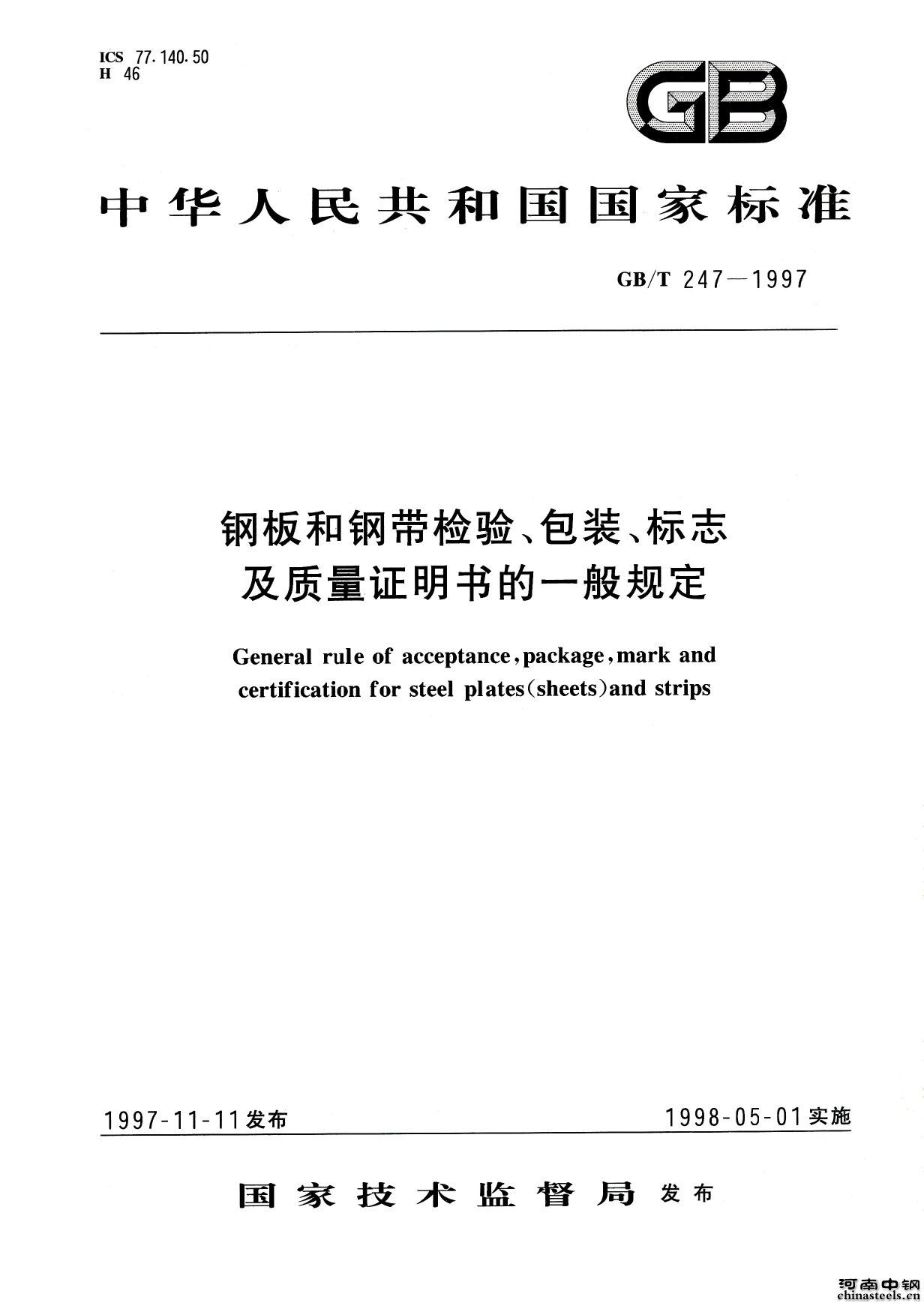 GB/T247-1997钢板和钢带检验、包装、标志及质量证明书的一般规定