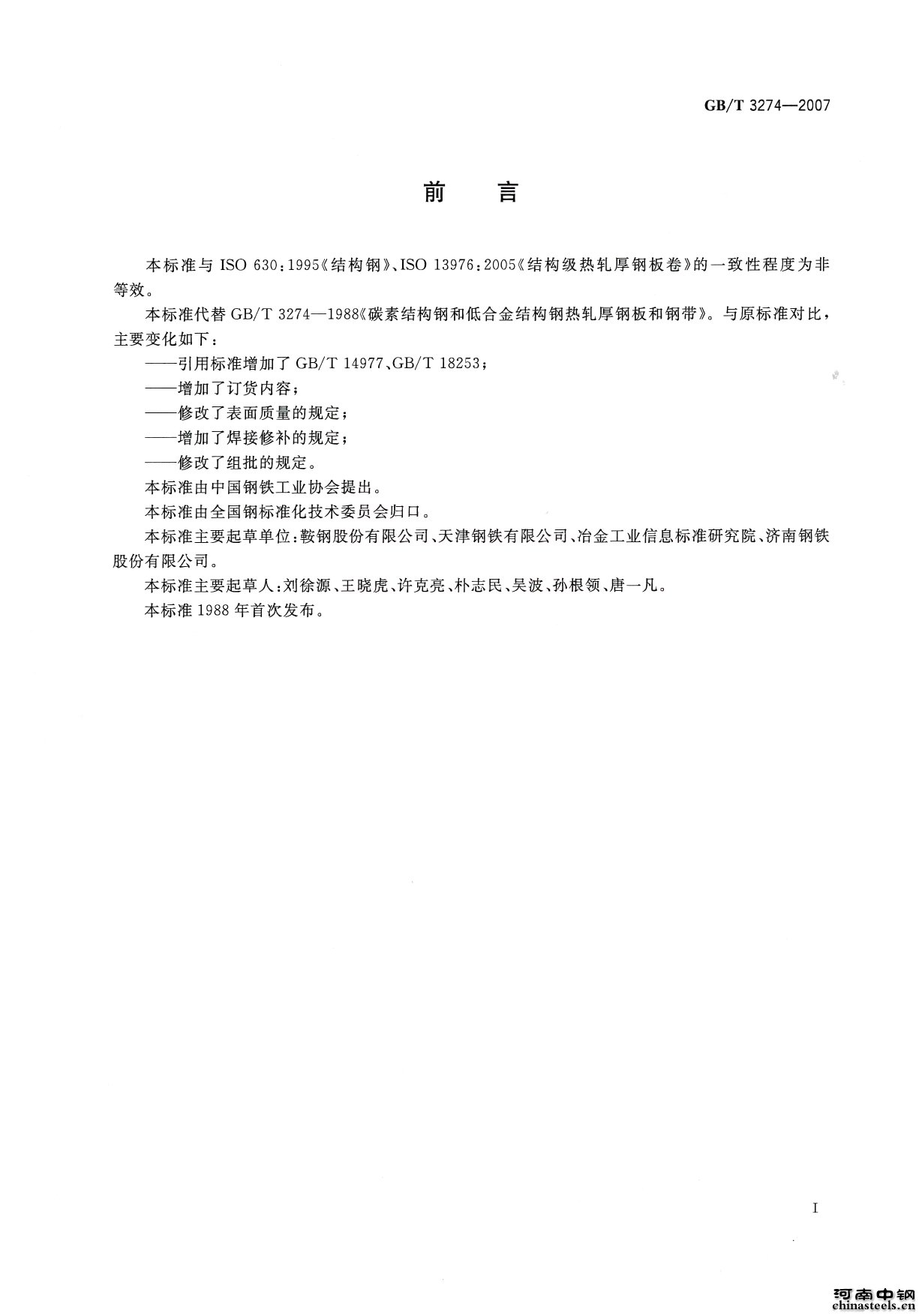 碳素结构钢和低合金结构钢热轧厚钢板和钢带GB3274-2007